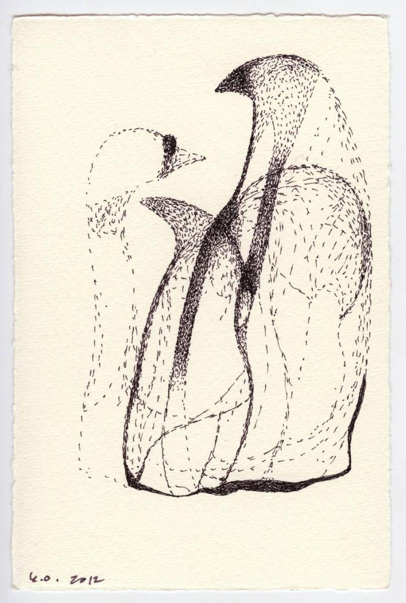 The imagery in Yoko’s Franklin Summer drawings (1995-2013) resembles starling murmurations. The lines are at once geometric and organic, amorphous – the literal floating world of Ukio e 浮世絵, which translates as ‘picture[s] of the floating world’. It seems that Yoko is drawing molecules, and we can see the energy vibrating in each picture. Most of the images evoke aspects of nature; aquatic, avian and inter-gallactic. Many of her abstractions are often of birdlike, including shapes that are embryonic and egg-shaped.