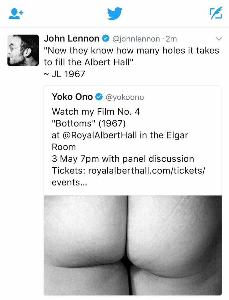 “In 50 years or so, which is like 10 centuries from now, people will look at the film of the 60’s. They will probably comment on Ingmar Bergman as meaningfully meaningful film-maker Jean-Luc Godard as the meaningfully meaningless. Antonioni as meaninglessly meaningful, etc, etc. Then they would come to the No. 4 film and see a sudden swarm of exposed bottoms that these bottoms, in fact belonged to people who represented the London scene. And I hope that they would see that the 60’s was not only the age of achievements, but of laughter. This film, in fact, is like an aimless petition signed by people with their anuses. Next time we wish to make an appeal, we should send this film as the signature list.” – Yoko Ono London ’67