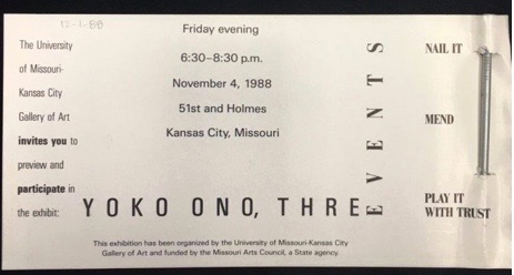 The invitation announcement to the November 1988 exhibit, Three Events (Nail It, Mend, Play It With (sic) Trust) at University of Missouri was pierced by a silver nail.