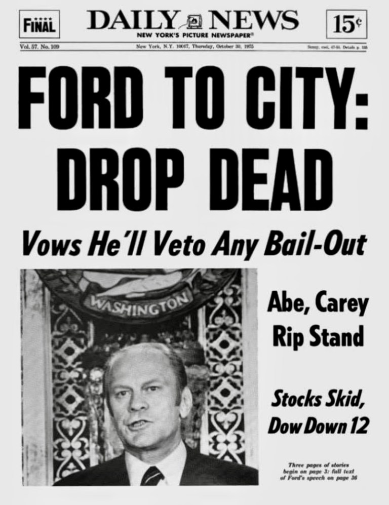 Two years prior, in 1975 the President had forsaken the bankrupt New York City, denying federal assistance. A Daily News headline read, “Ford to City: Drop Dead.”
