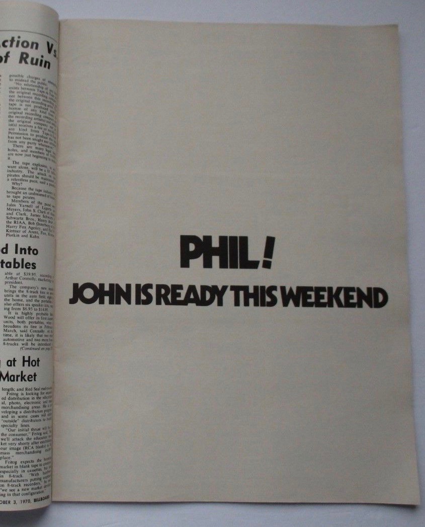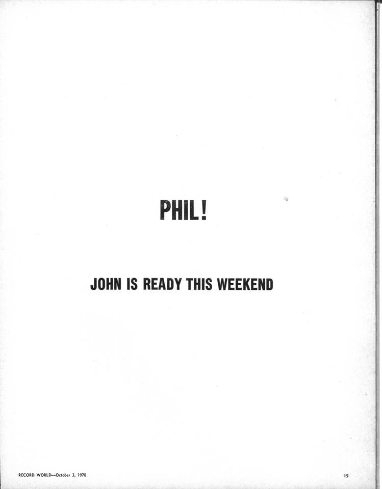 Phil Spector had been booked as the producer on the John Lennon/Plastic Ono Band recording sessions, but most songs were recorded, and mixed by John in the evenings without Phil being present in the London studio.In October 3, 1970, while sessions were underway, John published this hilarious, simple full-page advertisement in the major trade publications of the day; Billboard, Cash Box and Record World magazines –