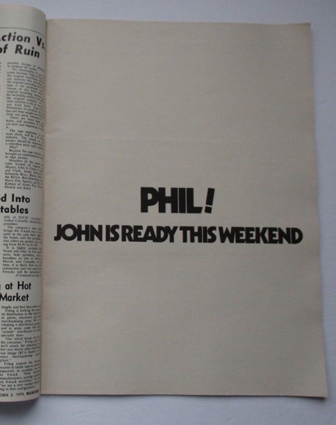 Phil Spector had been booked as the producer on the John Lennon/Plastic Ono Band recording sessions, but most songs were recorded, and mixed by John in the evenings without Phil being present in the London studio.In October 3, 1970, while sessions were underway, John published this hilarious, simple full-page advertisement in the major trade publications of the day; Billboard, Cash Box and Record World magazines –