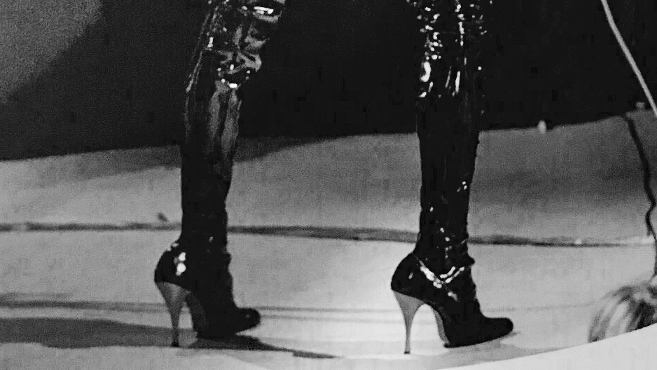 The outfit was positioned next to my other favorite Floor Show Costume – the red vinyl Burretti bodice with black / red sequins and black feathers is called Angel of Death. It’s surprising that the legs are shorts, which are covered by Bowie’s tall boots. This outfit was so nice that Bowie wore it twice! During ‘I Can’t Explain and in his duet with Marianne Faithfull, ‘I Got You Babe’. It was missing one feathered wristband and most importantly, the lace-up stiletto thigh high boots.But nonetheless, it was breathtaking! I envisioned Bowie smiling as the feathers grazed and tickled his face as he shimmied in this wacky creation on the show.