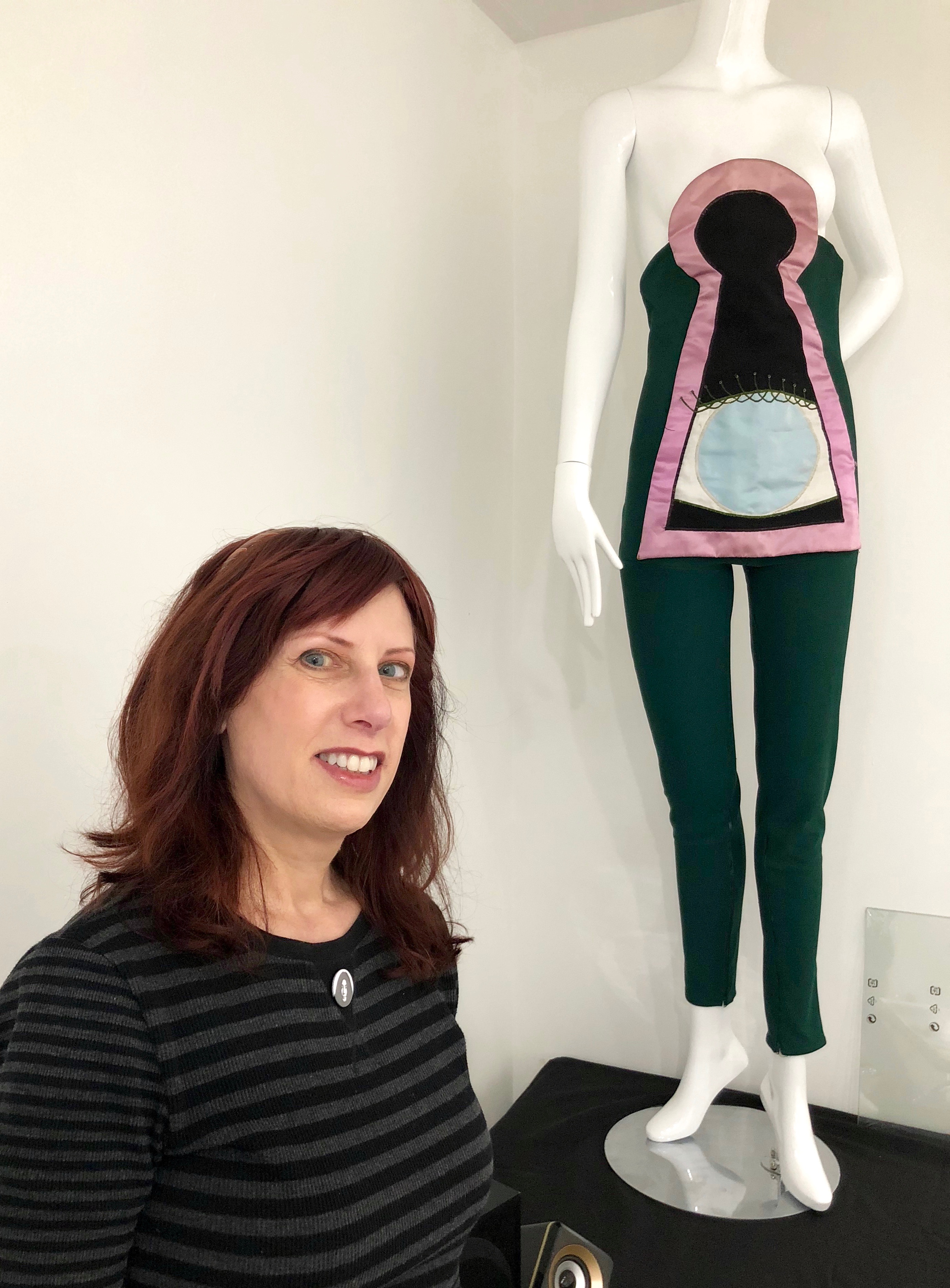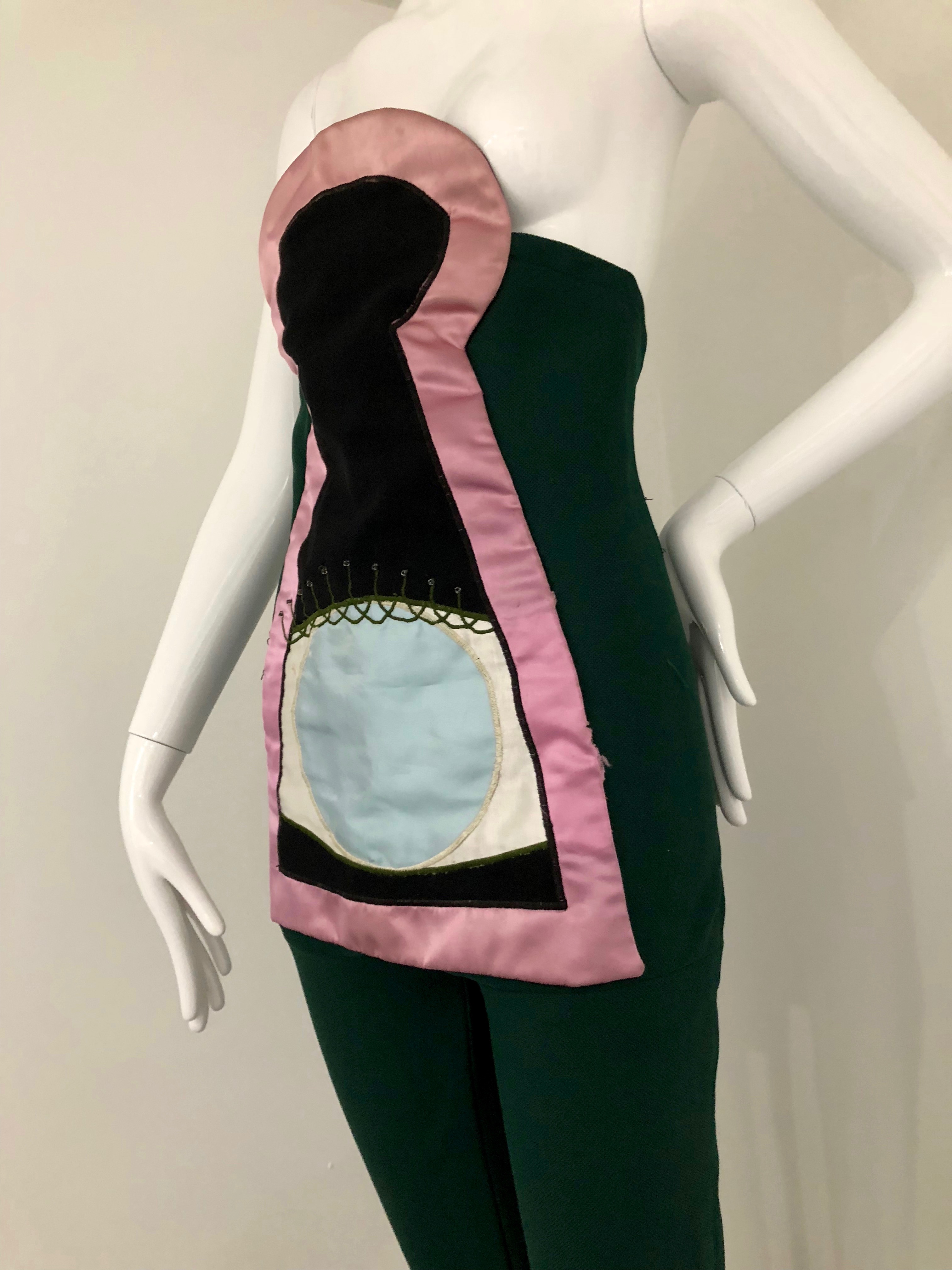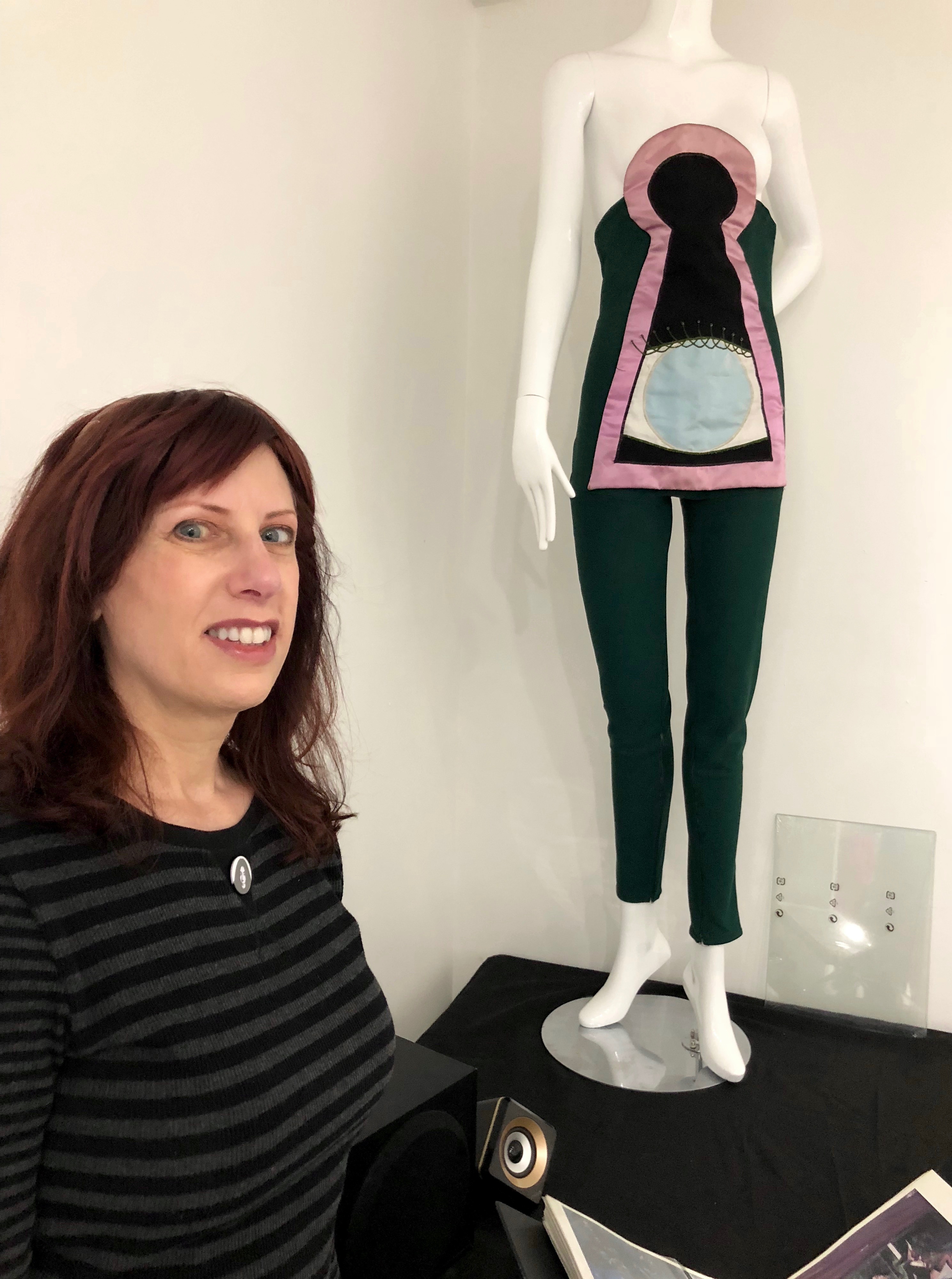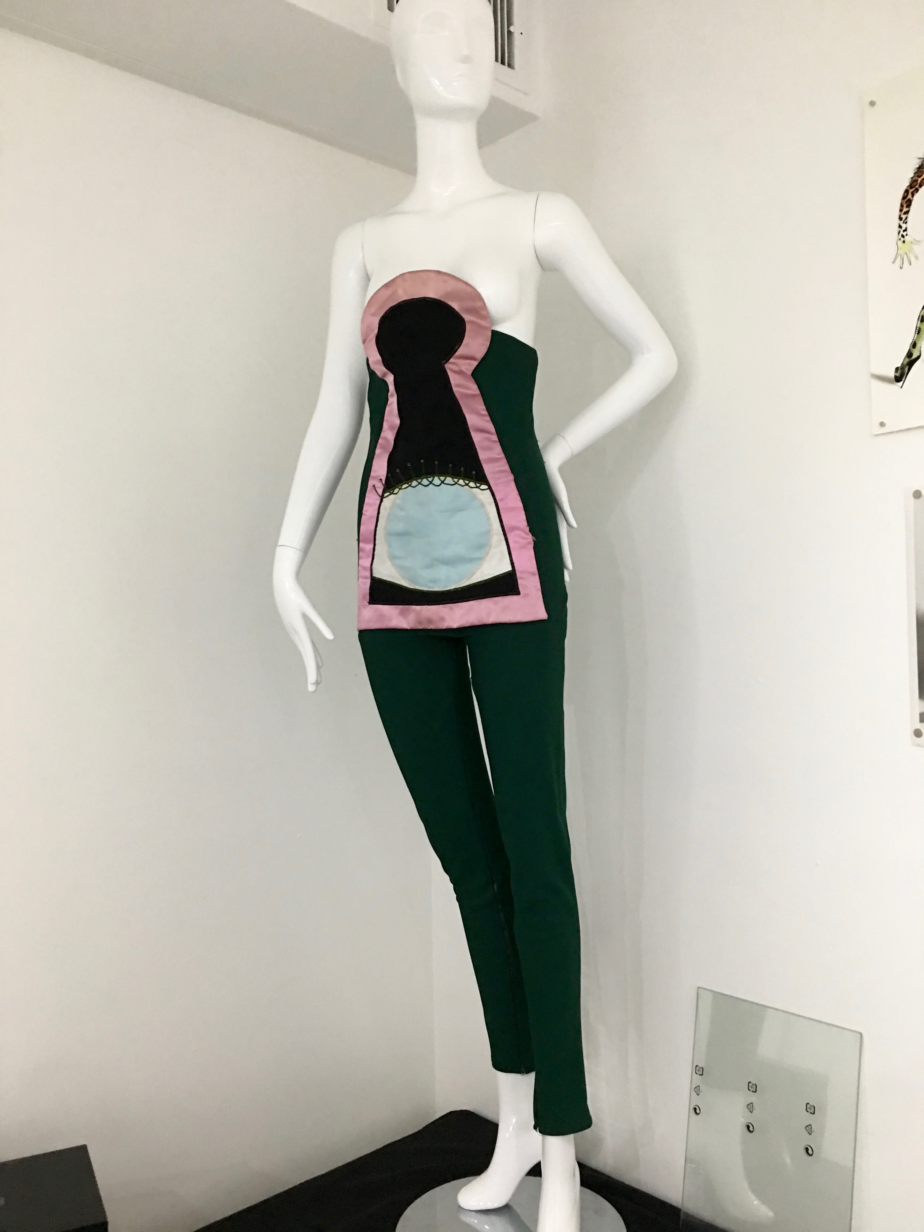 A very important 1980 Floor Show costume was missing from the exhibition. The green costume with the pink satin keyhole worn during ‘You Didn’t Hear it From Me’ is in a private collection. The design is inspired by the German Cabaret Voltaire movement’s Dadaist designer Sonia Delaunay who created many of Tristan Tzara’s outfits). This is is the reveal once the colorful Space Samurai snap-front costume is pulled off.