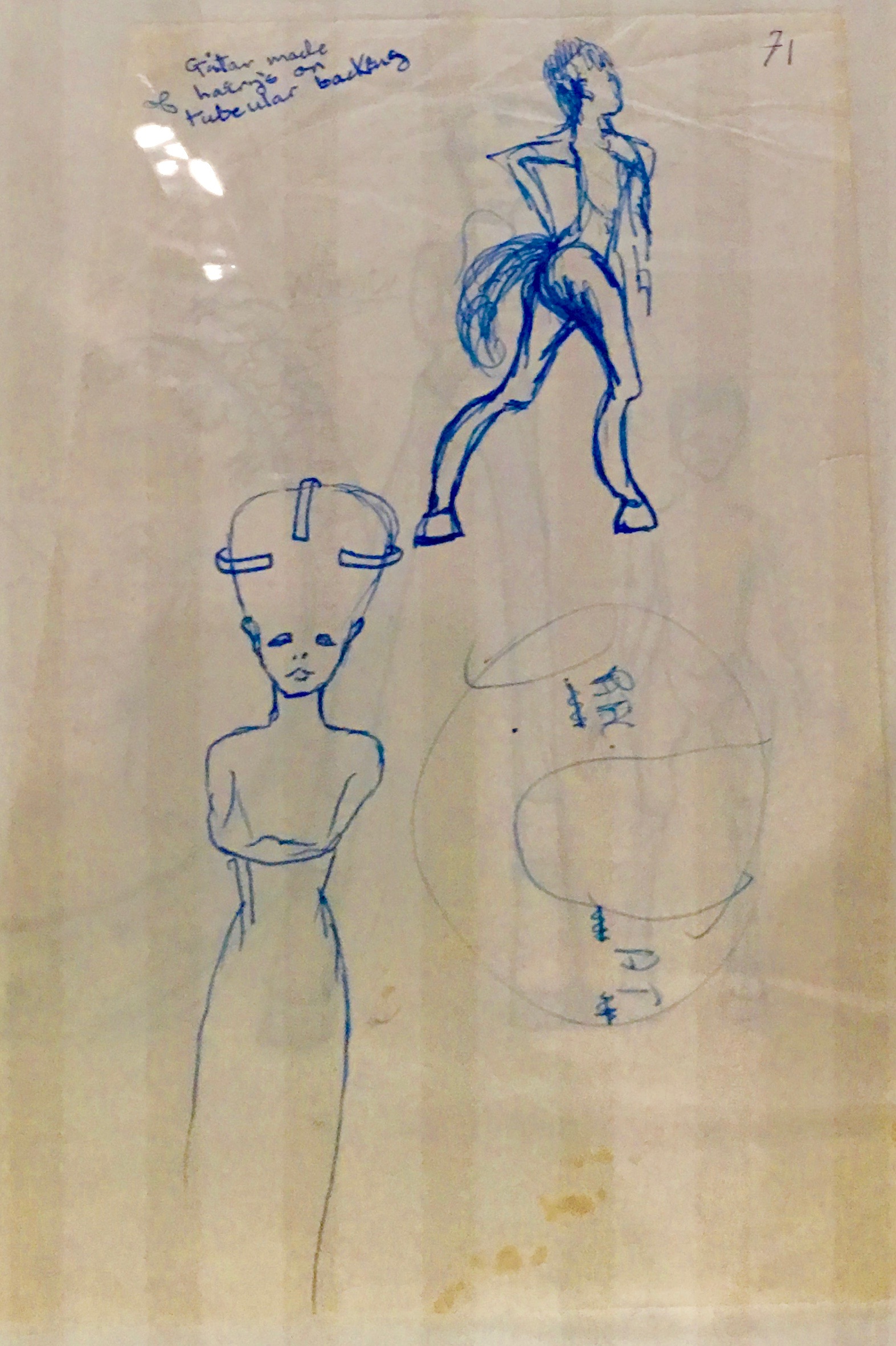 It was interesting to see Bowie’s original concept sketch of this costume. His sketches appeared for the first time in the Brooklyn installment of the exhibition! David’s drawing indicates that it was meant to have additional keyholes at the top of some sort of boots or leggings instead of the plain green one-piece that it became.