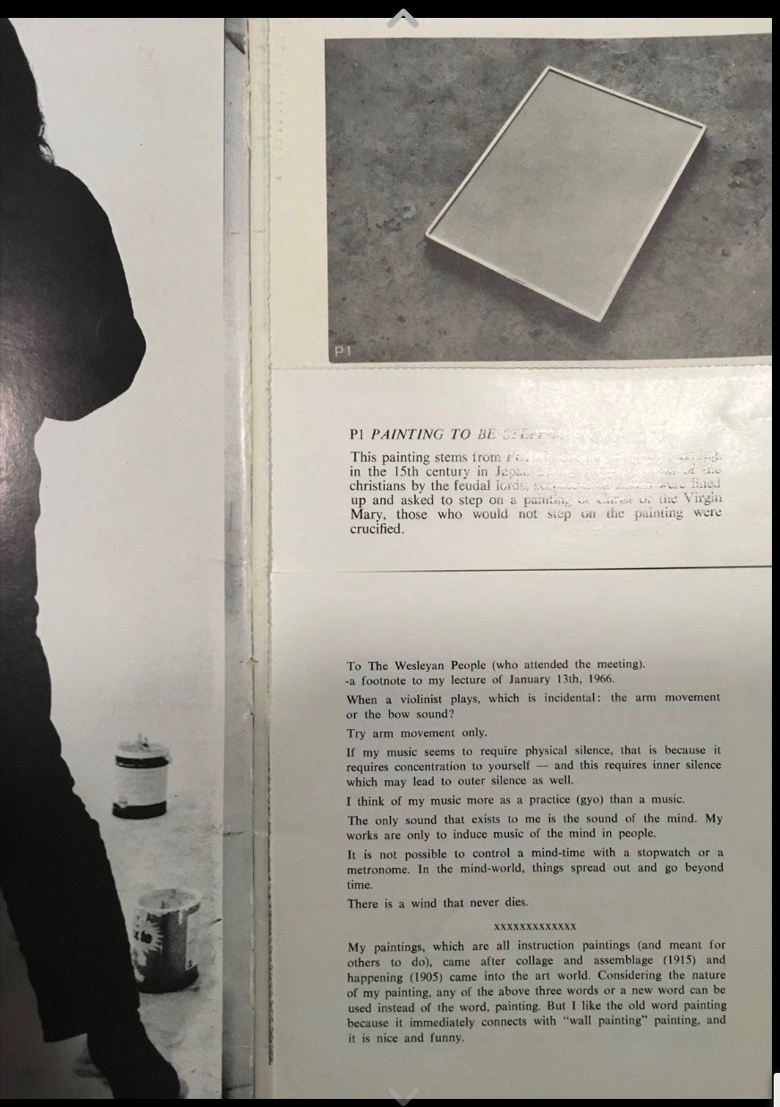Yoko showed up at my house and said, ‘Have you got any original manuscripts?’ She was doing a thing for John Cage in New York. So I was interested. I knew of him through [Barry] Miles and various other people like [John] Dunbar. I didn’t want to give her one, because I keep them, and in the end I wasn’t really too forthcoming – I just didn’t want to give her one, quite simple. So I said, ‘I’ve got this friend, who might be able to interest you.’ Maybe if I hadn’t done that there might not have been this sort of huge period for them… who knows? So then she went round to John. I think that was before the meeting in Indica which is the great story. I’m not sure, it might have been there she said, ‘You’re the guy Paul told me to come and see …’ I’m not sure. I certainly do know that I met her before John as part of my interests.”