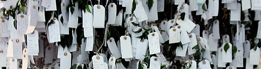 As a child, Yoko visited Japanese shrines where it is an old custom for people to purchase and tie pre-printed tags with messages onto trees. The wishes were simple, such as ‘Good Luck’ or ‘Good Health’. The multitude of white papers tied to the trees resembled blooming white flowers. Yoko decided that this time people should write their own wishes.