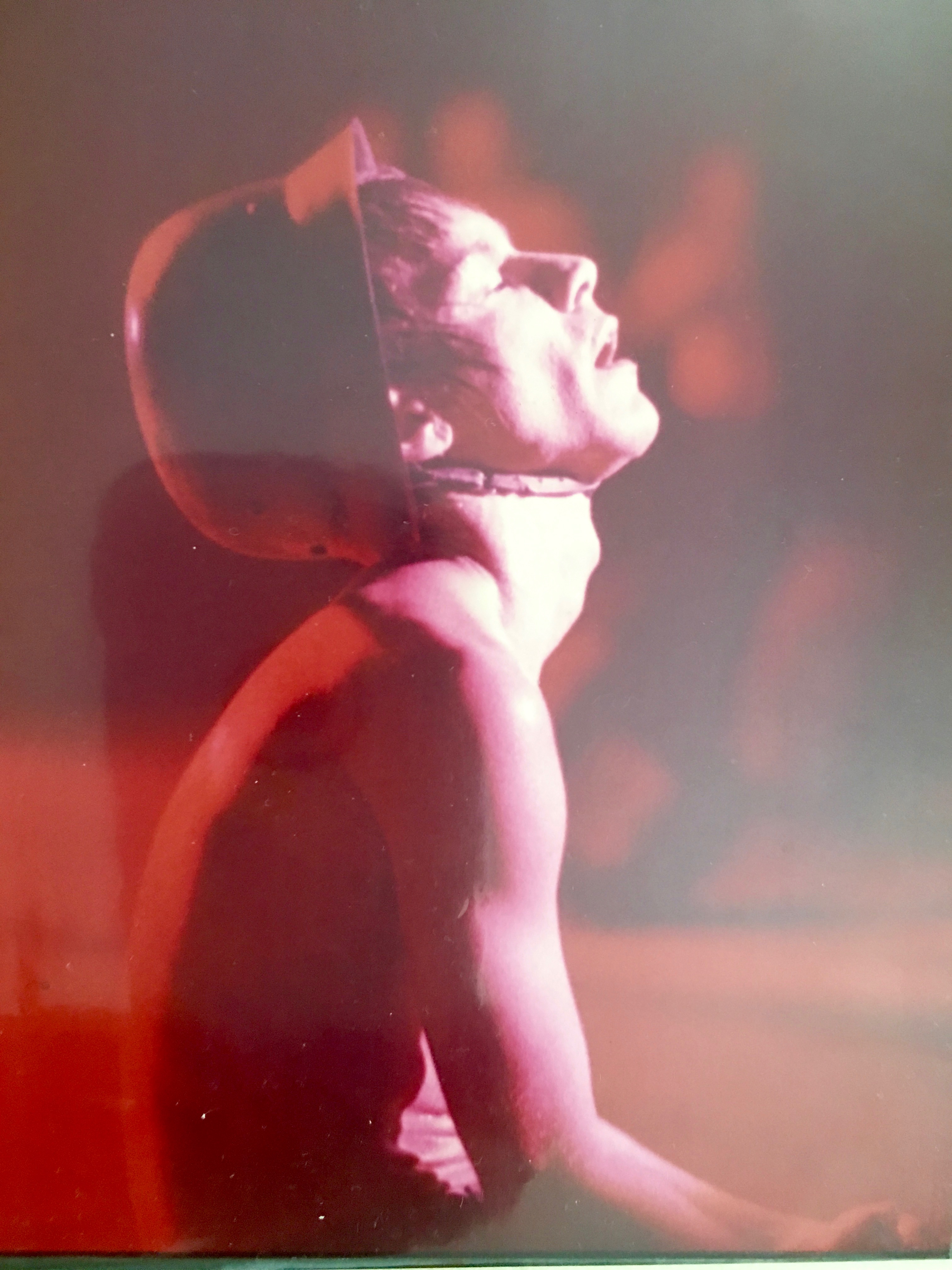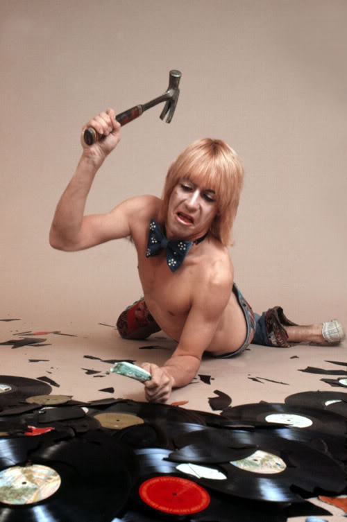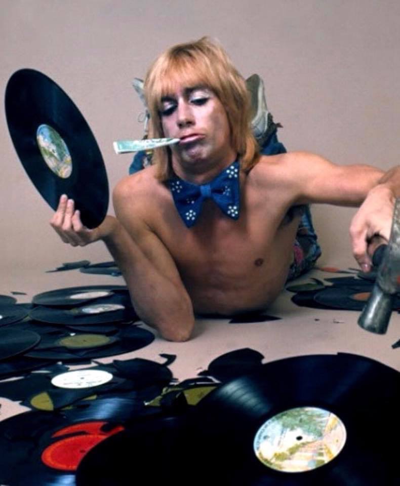 A proud Iggy, missing a tooth surveys the ‘gifts’ he received from the crowd in disapproval of his outfit when opening for the Rolling Stones at Detroit’s Silverdome wearing a leather mini-skirt in 1981. The numerous missiles were removed from the stage using a snow shovel.