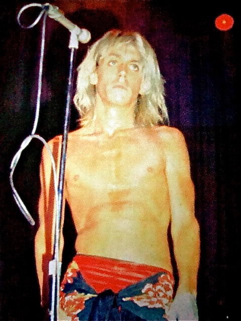 Iggy wore a stylish patterned pair of low-slung trousers made by MC5 vocalist Rob Tyner’s wife Becky at a Stooges gig at Mothers in Romeo, Michigan in August 1968. In all the commotion surrounding Iggy’s stage moves, these hip-huggers failed to hug his hips, leading to Iggy’s arrest for public nudity.