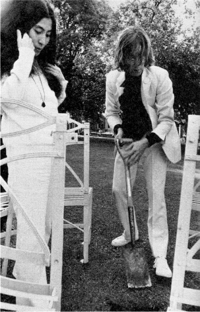 At their first event together in June 1968 (Acorn Peace), John and Yoko planted two acorns beneath a circular white garden bench at St. Michael’s Cathedral in Coventry, England as part of the National Sculpture Exhibition.