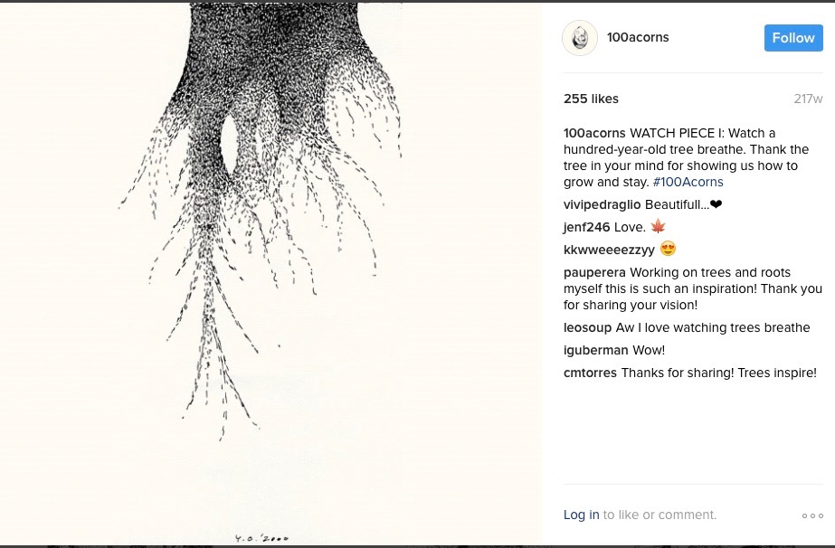 In 1996, Yoko organized a worldwide online event, Acorns: 100 Days with Yoko Ono, based on her instruction pieces. Beginning on the 40thanniversary of the Acorn Peace event, Yoko posted a cathartic, wise or perplexing instruction every day for 100 days. https://www.instagram.com/100acorns/