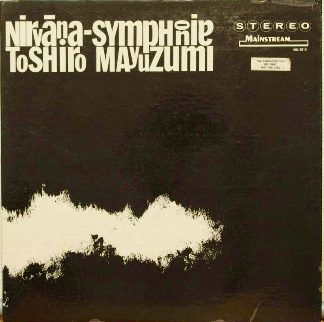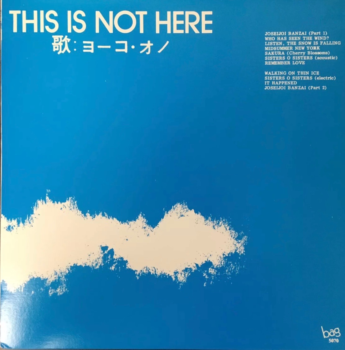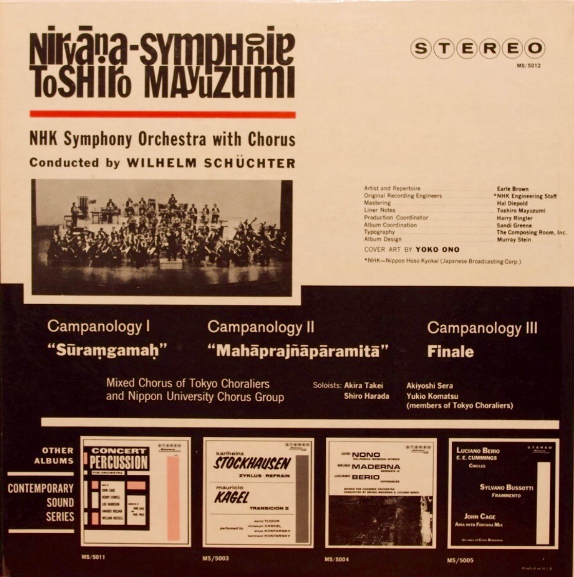 Yoko Ono created the artwork for Toshiro Mayuzumi’s 1958 album Nirvana-Symphonia. The music was based on the traditional Japanese sounds made by Buddhist temple bells. The cover image is a monochromatic version of a single cloud in the sky. It is similar to the cloud (and its lower left side positioning) photographed by Iain MacMillan which appears with a sky-blue background on John & Yoko’s 1969 album cover, Live Peace in Toronto. The Mayuzumi cloud also appears as the cover art for a Yoko bootleg album of rare singles and b-sides (Bag 5070) titled This Is Not Here – named after her 1971 art exhibition in Syracuse, New York.