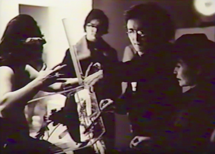 Charlotte and Yoko both presented themselves nude publicly as artists. Yoko was unclothed by her audience during Cut Piece, and later appeared naked with John Lennon on the cover of their 1968 album Unfinished Music No. 1: Two Virgins. Charlotte became infamously known as the “Topless Cellist” after being arrested on-stage in February 1967 while performing Paik’s Opera Sextronique at New York City’s Film-Makers Cinematheque, co-founded by Jonas Mekas (which later became Anthology Film Archives). Charlotte made headlines when she was arrested during the second half of the performance. During the ludicrous trial, lawyers debated about whether nudity and sex constituted art, as the legalities of these issues were unprecedented.