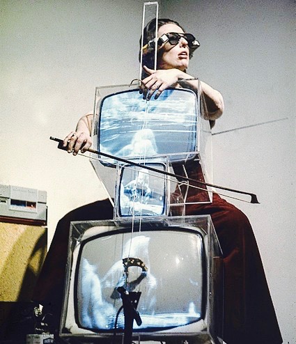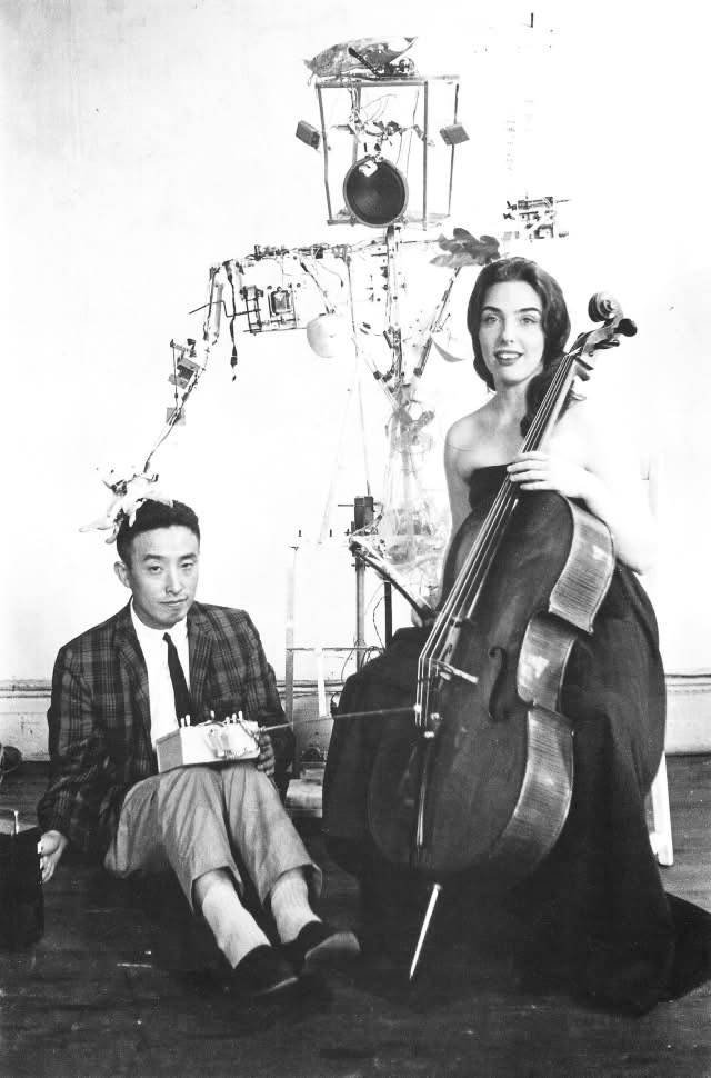 Charlotte soon performed with John Cage and with founders of the Fluxus movement until she was inexplicably shunned by its founder, George Maciunas. Charlotte often collaborated with Nam June Paik, with whom she merged several art forms including performance and sculpture. For Charlotte, Paik created TV-Cello (1971) an electronic cello made with three stringed television sets (which emitted sounds of static as she bowed across it) and also TV Bra for Living Sculpture (1969) in which Charlotte was naked except for two small television sets attached to her breasts while she played the cello.