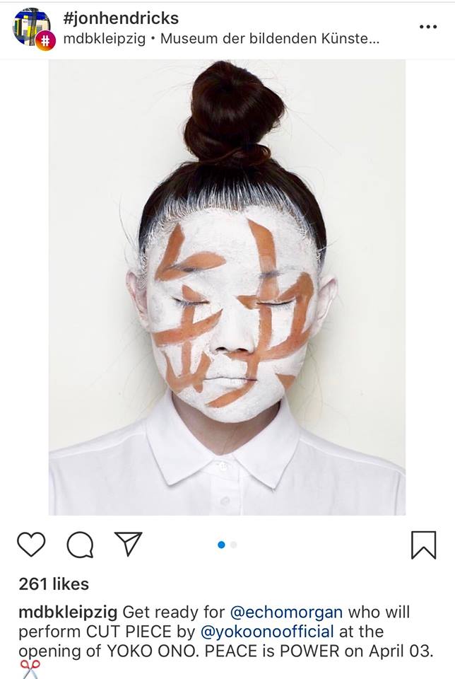 I had a wonderful chat with artist Echo Morgan about her performance. Yoko requested that Cut Piece be performed at the opening of her Peace Is Power exhibition in Leipzig. Over time this masterpiece – performed many times by Yoko and by other artists – has become legendary. Echo Morgan was approached by the museum to be the performer, as they were interested in bringing her own art to the museum at a later date.