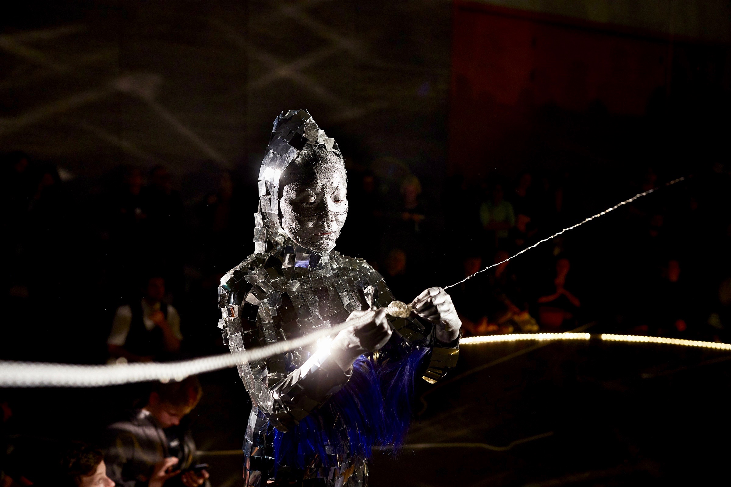 Xie Rong: “I wish to create a piece to bring illumination and sound into the darkness. To connect all the rooms into the main hall, create movement of audiences. From 9:30 Andreas played music create tension and atmosphere. 10pm, Me, in a mirror suit, walking into the main hall. I stood inside a rope light, silent, I will sing “Olive Tree” then I walk off to collect all the ropes, I shout out to each floor and balcony, drag ropes between people. Creating spider web collection between the three museum floors and four exhibition rooms.