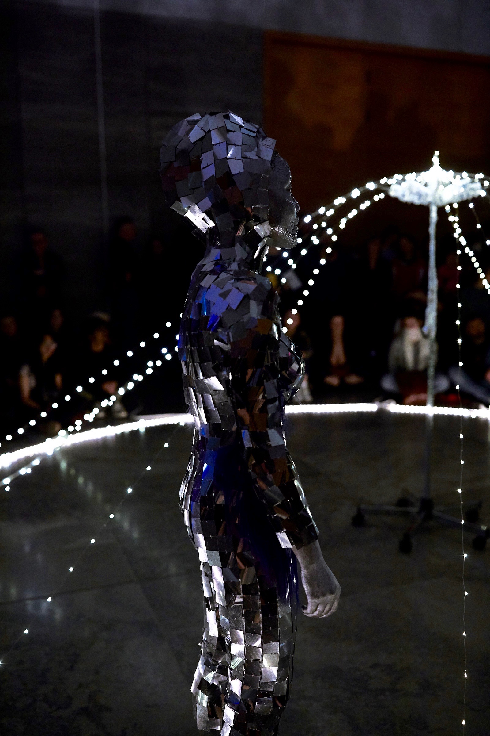 “Voice and sound is very important to this piece! it’s very site-specific also. The main hall has many doors, stairs and balconies to other floors and space. They expected 4,000 visitors on the museum night, ended up to 6,000 people! Many of whom never go to museum apart from this once a year opportunity, so I wanted to create something that’s very eye catching, shining like a light house! My imagery can be easily related to fashion, makeup, pop culture, club, street art, science fiction, movies … so it’s very inclusive! People might not understand the Chinese song but singing always takes people to elsewhere! a foreign land! Mirrored suit has great refection that projects lights back on to the audience so the experience is shared!”
