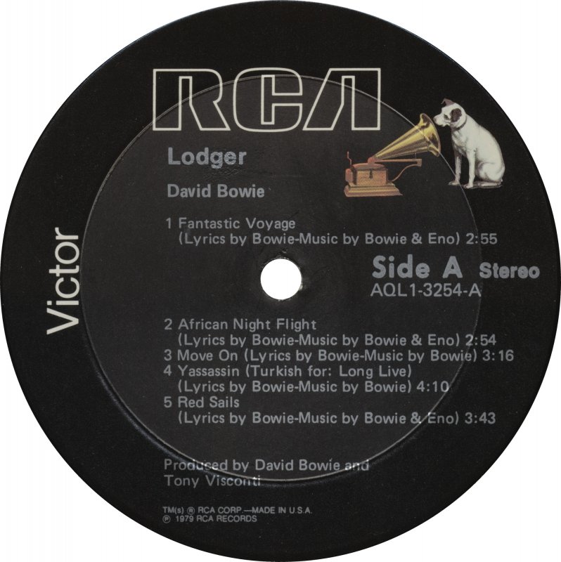 From 1975 through 1976 some RCA labels were still orange, but gradually they became light brown/pale gold. The reissue labels look the same, but they just say ‘Bowie’, omitting ‘David’. Bowie’s Young Americans was first issued on the RCA orange label but was quickly reissued on the tan label. Sometime in 1976 the RCA label became black again with Nipper (RCA’s dog with gramophone mascot/logo) located in the upper right. Some black labels still carried the dynaflex trademark even though the records were pressed on thicker vinyl. Low, “Heroes”, Stage and Lodger all have black labels. The disc for “Heroes” is much thicker than the others.