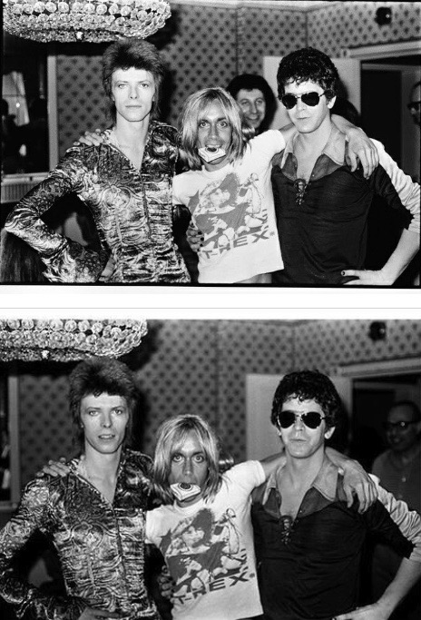There is a nearly identical photo, in which Iggy is smiling. Mick Rock has photoshopped Bowie’s manager Tony DeFries out of the photo (who was lurking in the background) which he now sells as a limited edition at his gallery exhibitions.