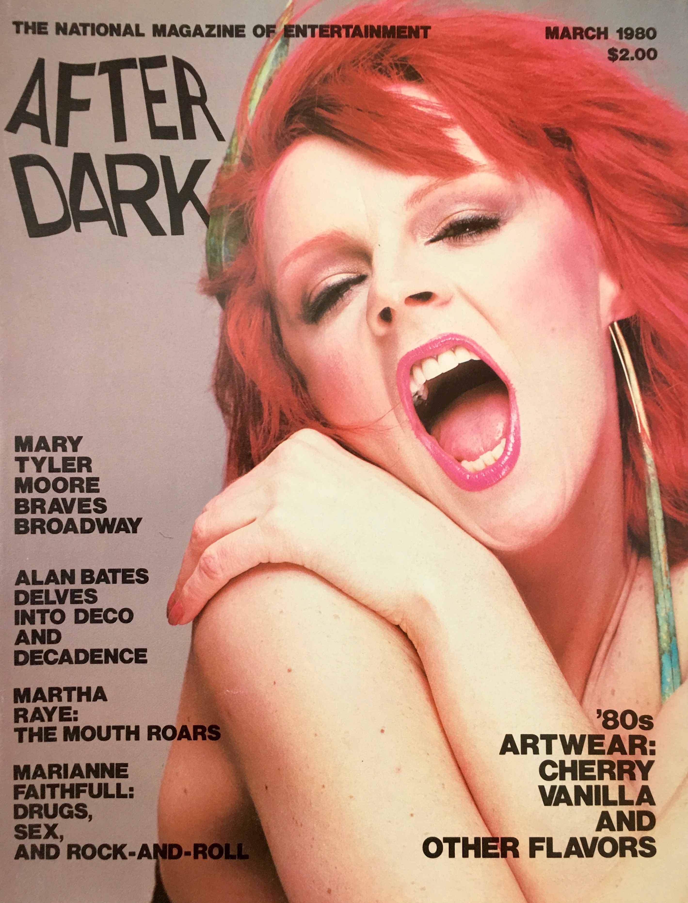 I made it up while recording an Abbie Hoffman anti-war tape for Radio Hanoi. I had never intended to use it for anything else, but Lester Bangs, an editor at Creem Magazine, suggested I use it for the pieces I was writing for him and for other rock magazines at the time. Since I was also writing for sex magazines back then, it proved useful in keeping my parents from knowing it was me. I never officially changed my name to Cherry Vanilla, but I got a DBA so that I could get paid as such. And in 1971 I joined Actor’s Equity, using it as my stage name, same as I did with SAG, AFTRA and ASCAP in the years following. When the Bowie’s came to town in 1972, Angie started calling me Vanilla, and eventually all of my friends followed, using one form or other of the name … Cherry, Vanilla, Ms. Vanilla or C.V. When I dyed my hair a maraschino pink (1973) and began performing my own poetry (1974) the transformation was complete. Except for the name on a few legal documents, Kathy Dorritie was no more. Cherry Vanilla seemed a much better fit.