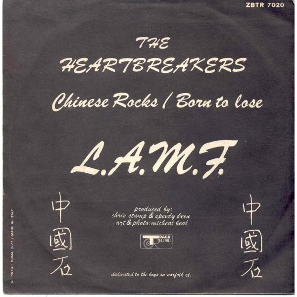‘Chinese Rocks’ was released by Johnny Thunders & The Heartbreakers as a single (the B-side was ‘Born To Lose’) and on their 1977 debut album L.A.M.F. (Like a Motherfucker). The title is a street term for super-potent Vietnamese heroin. On The Heartbreakers’ album, the song is credited to Thunders/Jerry Nolan/Richard Hell and Dee Dee Ramone. The song was actually written by Dee Dee and also appears on the Ramones’ 1980 album End of the Century as ‘Chinese Rock’. On the Heartbreakers’ version Johnny sings, “Hey, is Dee Dee home?” On the Ramones version, the lyrics sung by Joey are changed to, “Hey, Is Arty home?” (referring to pal Arturo Vega, designer of the Ramones logo). Johnny Thunders and Dee Dee Ramone were notorious drug buddies.