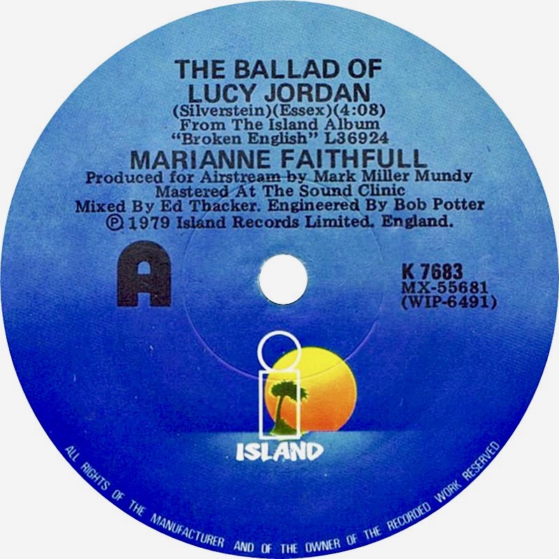 Marianne Faithfull’s beautiful version of ‘The Ballad of Lucy Jordan’ appears on her ‘comeback’ album Broken English (1979). After a three-year silence between albums, Marianne returned with a very different voice. Her sweet serenades of the 1960s were now a thing of the past. This new voice was cracked and broken after severe laryngitis and years of drug addiction – yet a strange beauty emerged. The song subjects on Broken English were extremely harsh, and this voice was appropriate.