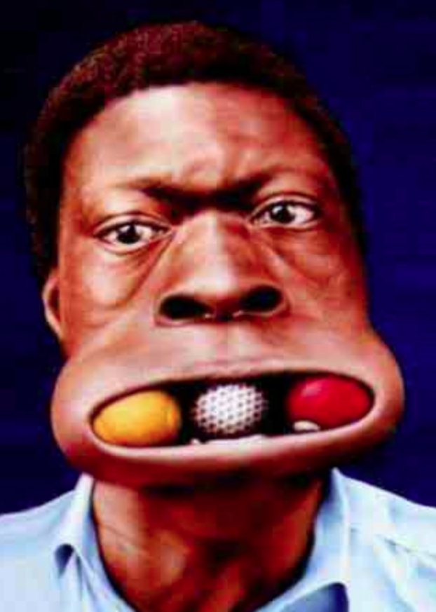 The photo titled Tattoo Parlor, 8th Avenue (a collage of circus side-show freaks) was shot by the late, great Robert Frank in 1958. It’s an outtake from his book The Americans. One of the featured photos in the composite (of Congo the Jungle Creep) was taken by the legendary Diane Arbus. The freakiest one is Three Ball Charlie who out-does a chipmunk by fitting three balls of various sizes in his wide mouth!