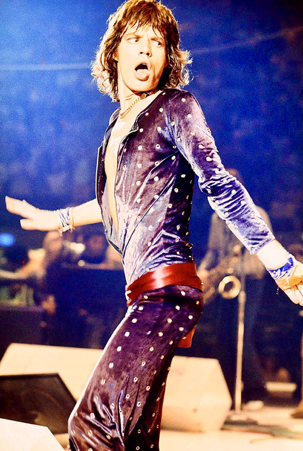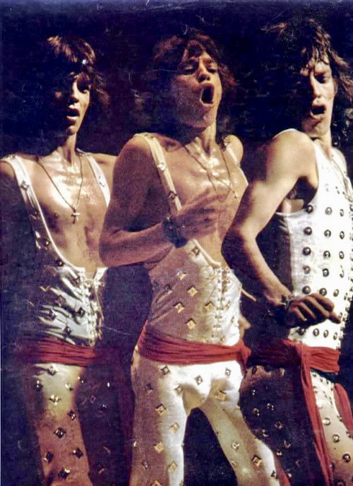 On the Exile tour, Mick featured his slinky Ossie Clark jumpsuits (one blue and one white) a much sexier twist on the ones made by Bill Belew for Elvis. Mick’s stage-wear is less stiff and more comfortable, in a light-weight velvet velour / lycra fabric with Perspex / metal studs and transparent sequins. They are worn with a colored silk sash tied around the waist. Throughout the 1970s designer to the stars, Ossie Clark created several jumpsuits for Jagger with various sleeve lengths (also sleeveless) with deeper and deeper necklines – more like crotch lines. A white one was auctioned by Christies in 2012 for 20,000 GBP. It has a lot of wear and tear in the pelvic region. Another white jumpsuit (a spare) was given by Sir Mick Jagger to the V&A museum. Mick appeared on a LIFE magazine cover in 1972 wearing the long-sleeved white jumpsuit.