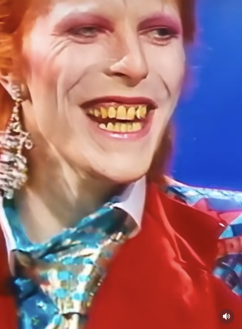 The film’s glittering color palette is delightfully shocking and phantasmagorical. Bowie’s yellowed teeth in the Russell Harty interview clip are even more yellow! (I eternally curse his dentist for the big white choppers that he got in the early 80s, replacing his gloriously crooked original teeth).